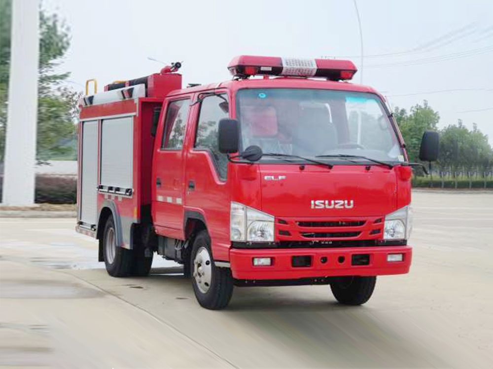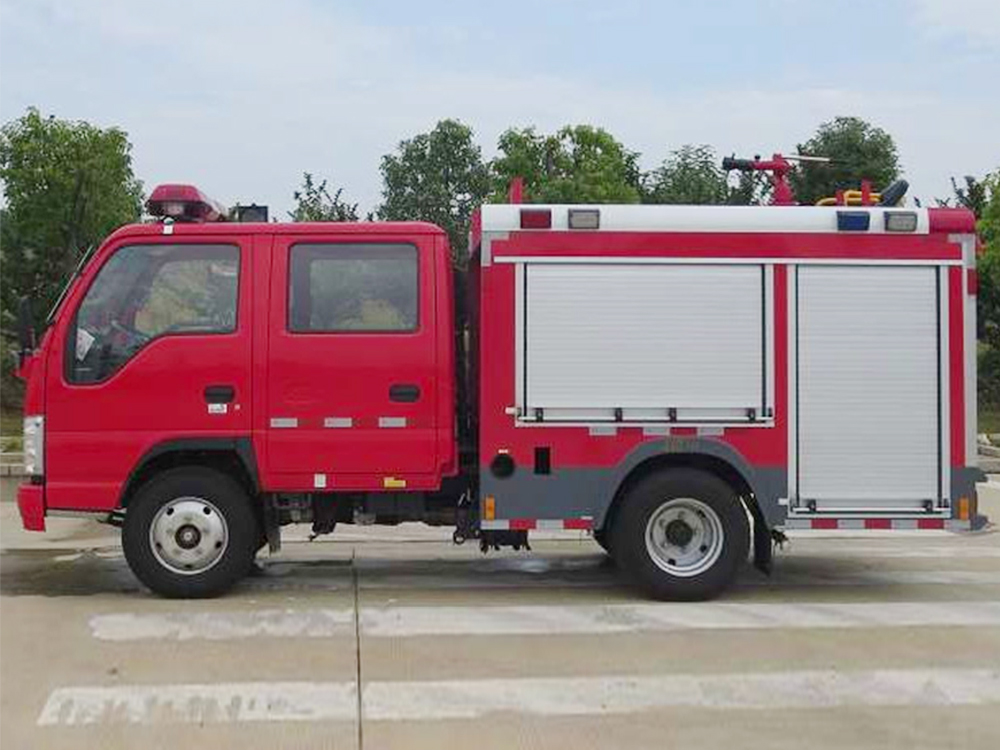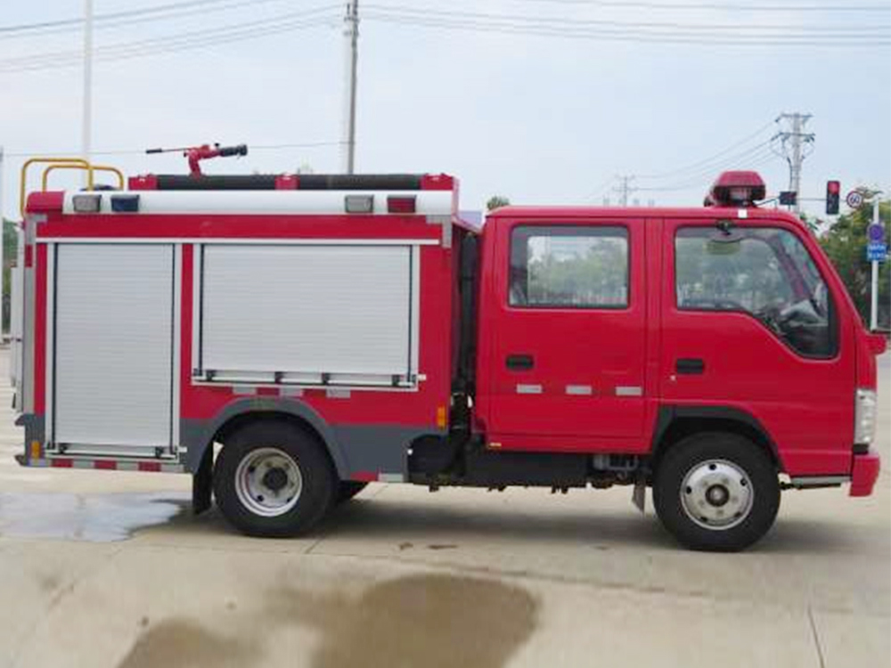 消防泵在箱体中间或者后置,泵房左右两侧4个出水口、器材箱左右后侧均有新款易拉高强度铝合金卷帘门。