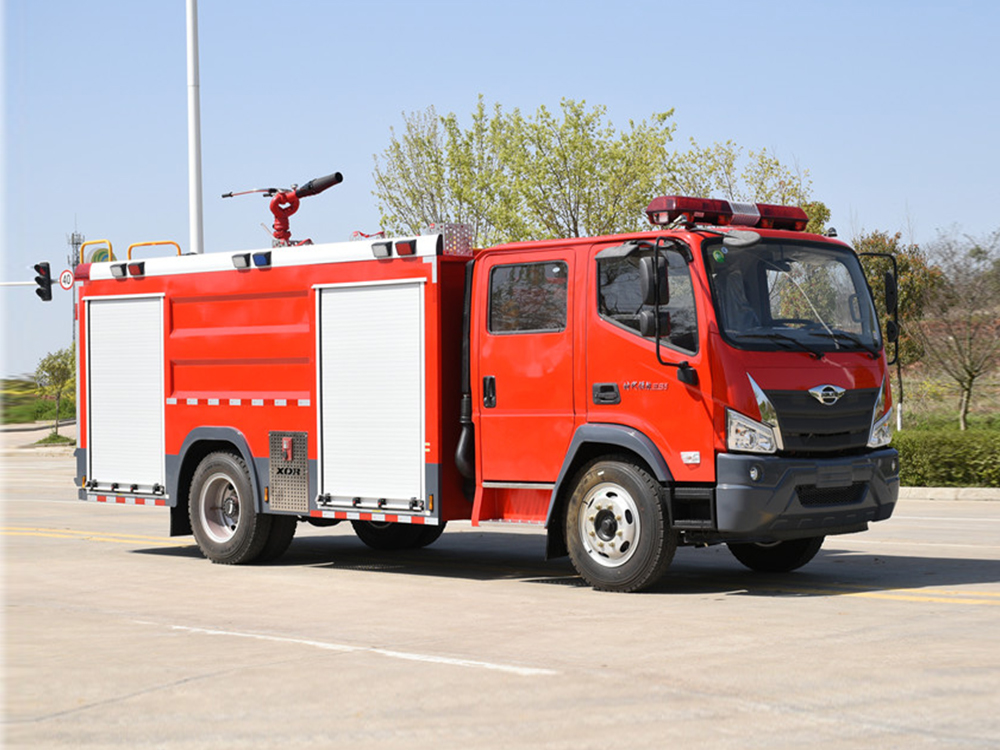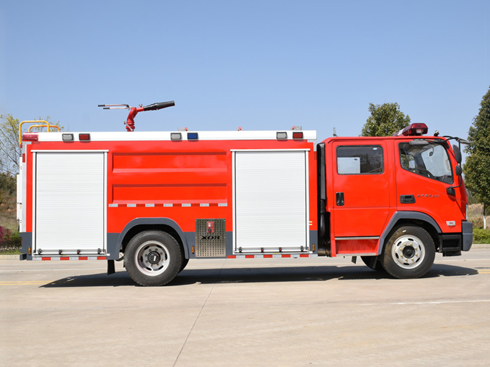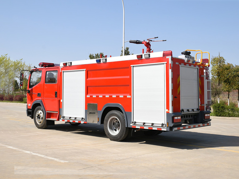 消防泵在箱体中间或者后置,泵房左右两侧4个出水口、器材箱左右后侧均有新款易拉高强度铝合金卷帘门。