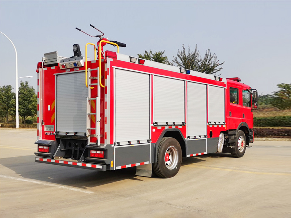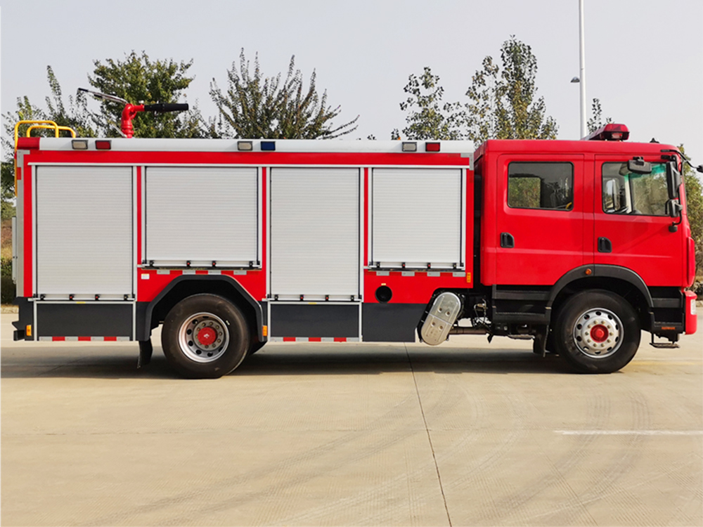 消防泵在箱体中间或者后置,泵房左右两侧4个出水口、器材箱左右后侧均有新款易拉高强度铝合金卷帘门。