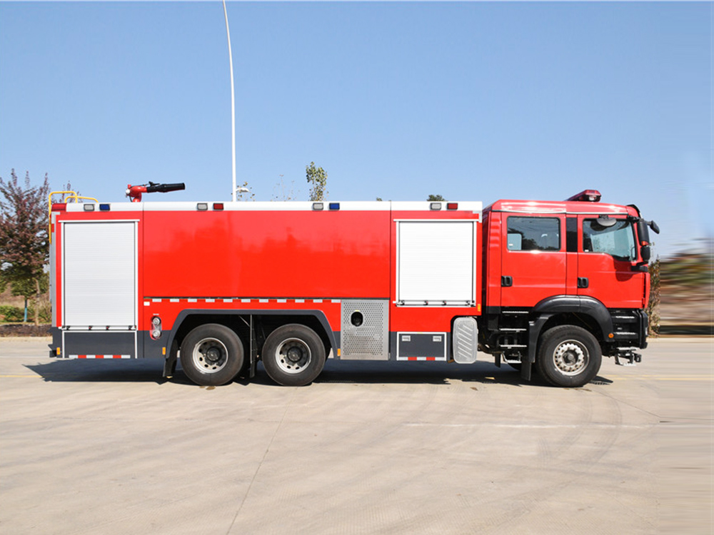 消防泵在箱体中间或者后置,泵房左右两侧4个出水口、器材箱左右后侧均有新款易拉高强度铝合金卷帘门。