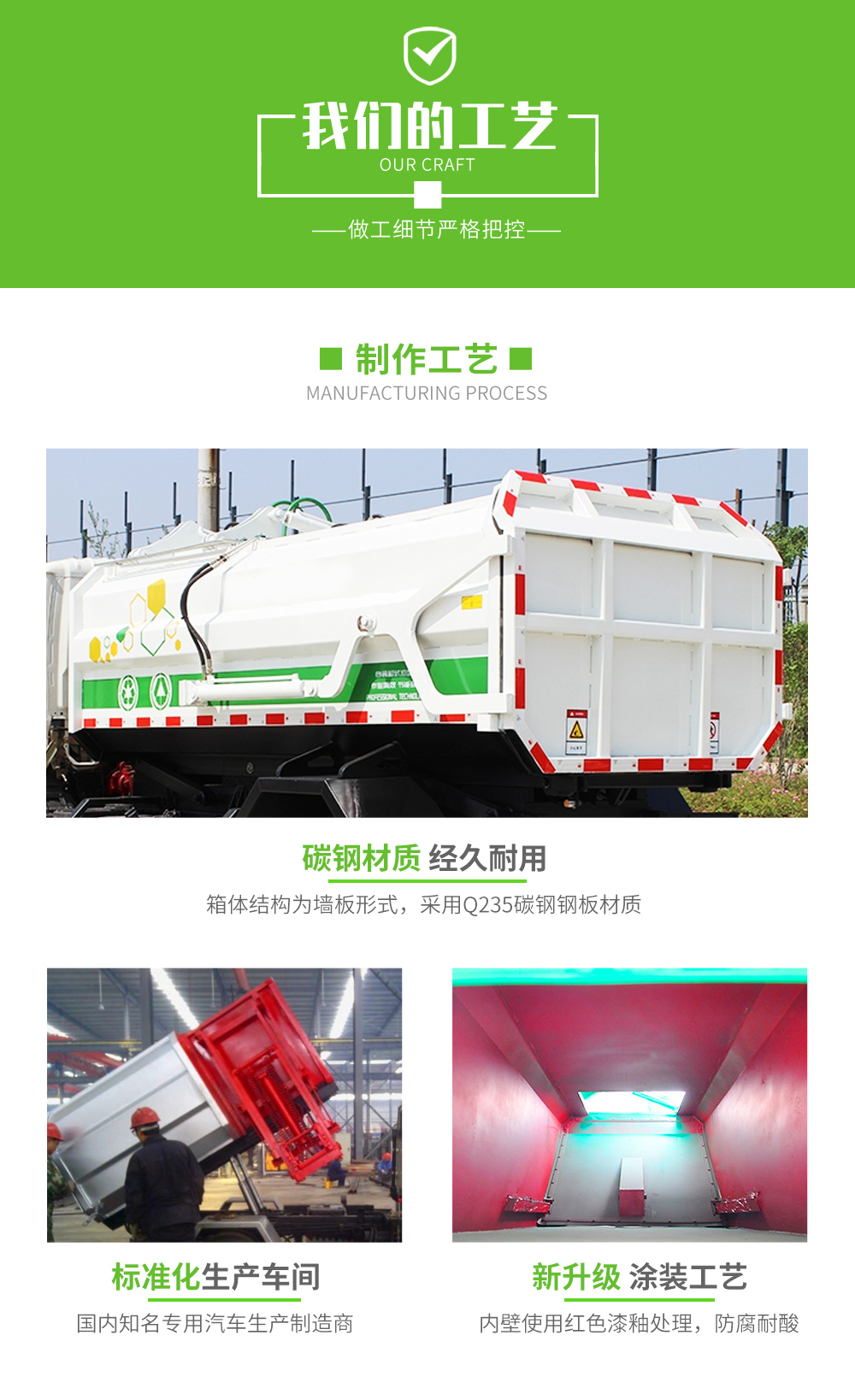| 整车说明: | 1,该车仅采用3950mm、4500mm、4700mm轴距。2,该车整备质量(kg)/轴距(mm)/整车长(mm)的对应关系为:8000/3950/7290,8400/4500/7840,8400/4700/8040;该车整备质量(kg)/额定载质量(kg)/准乘人数(人)的对应关系为:8000/9870/2,8000/9805,/3,8400/9470/2,8400/9405/3。3,防护材料:Q235B碳钢,连接方式:左右侧面及后下部防护均采用螺栓连接,后下部防护断面尺寸(mm):150×50,后下部防护离地高度(mm):500。4,ABS系统生产厂家,型号 :焦作博瑞克控制技术有限公司,J ABS。安装具有卫星定位功能的行驶记录仪。5, 仅采用的发动机型号与油耗值对应关系为(L/100km): B6.2NS6B210/26.3,CY4SK761/26.8,D4.0NS6B195/26.6,D4.5NS6B220/26.6,YCS04200-68/26.4。6,专用装置:箱体和挂桶机构,主要用于城镇环卫散装生活垃圾的收集与运输。 | ||