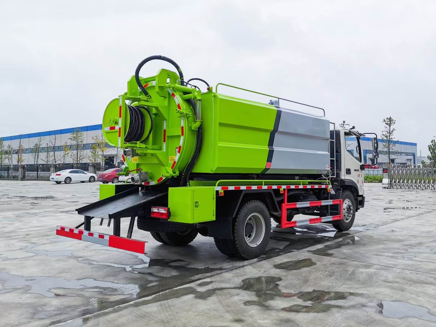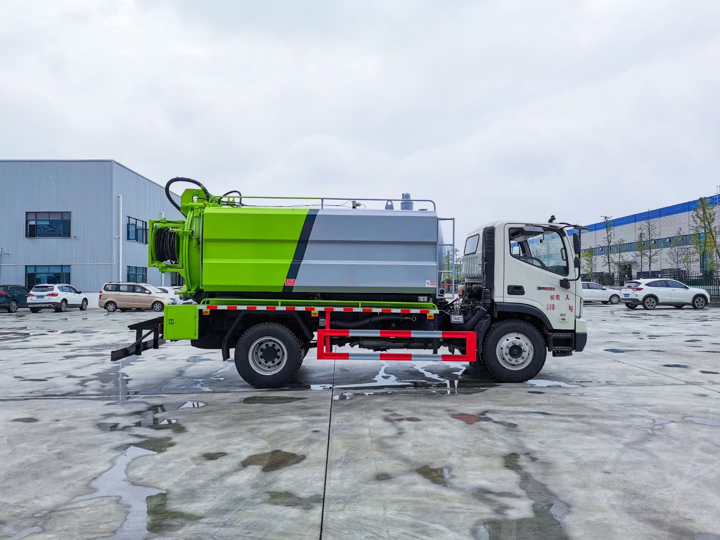 | 整车说明: | 该车装有取力器,高压水泵,高压水管,高压泵头,真空吸污泵以及水罐,吸污罐,用于清洗和吸污;整车长/轴距/罐体外形尺寸(长×直径)(mm)对应关系为:7350/3800/4200×1600,7750/4200/4500×1550,水罐罐体有效容积:3.72立方米,吸污罐罐体有效容积:4.65立方米,当轴距为3800时,水罐罐体外形尺寸(长×直径)(mm):1550×1600,吸污罐体外形尺寸(长×直径)(mm):2650×1600;当轴距为4200时,水罐罐体外形尺寸(长×直径)(mm):1650×1550,吸污罐体外形尺寸(长×直径)(mm):2850×1550;水罐和吸污罐为两个独立罐体,两罐不能同时满载.防护材料:Q235A碳钢,连接方式:左右侧面采用焊接连接,后下部防护采用焊接连接,后部防护断面尺寸(mm):150×60,后部防护离地高度(mm):480.ABS控制方式为4S/4M,ABS型号为CM4XL-4S/4M,生产厂家为广州瑞立科密汽车电子股份有限公司.随底盘选装驾驶室。 | ||