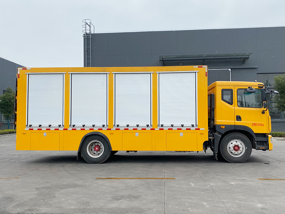 | 整车说明: | 车厢顶部封闭,不可开启。车辆主要专用装置:装有静音车厢、发电机组、电缆卷盘、救险设备等,内部可选装电驱式排水泵或柴油机驱动式水泵或液压水泵。专用功能及装置:发电机机组,远距离输电装置,电焊机以及应急抢险抢修时必备的光源,气源,电源设备,整车长/轴距/后悬对应关系为(mm):8680/4700/2720,8480/4500/2720,8180/4500/2420,7910/3950/2700,7610/3950/2400;防护材料为Q235碳钢,侧面防护由裙板结构构成,,离地高度430mm,后下防护采用螺栓连接,断面尺寸为Φ120mm,下缘离地高500mm;ABS系统生产厂家,型号 :焦作博瑞克控制技术有限公司,J ABS;襄阳东风隆诚机械有限责任公司,ABS/ASR-24V-4S/4M。安装液压尾板:后部尾板收起状态的水平长度是300mm,尾板质量为440kg。选装上装新外形,选装不带尾板。 | ||